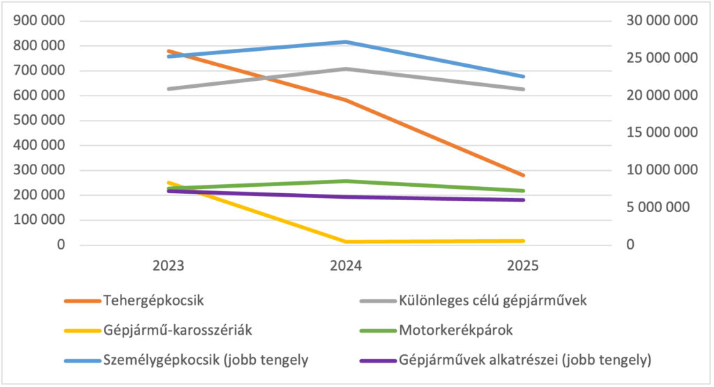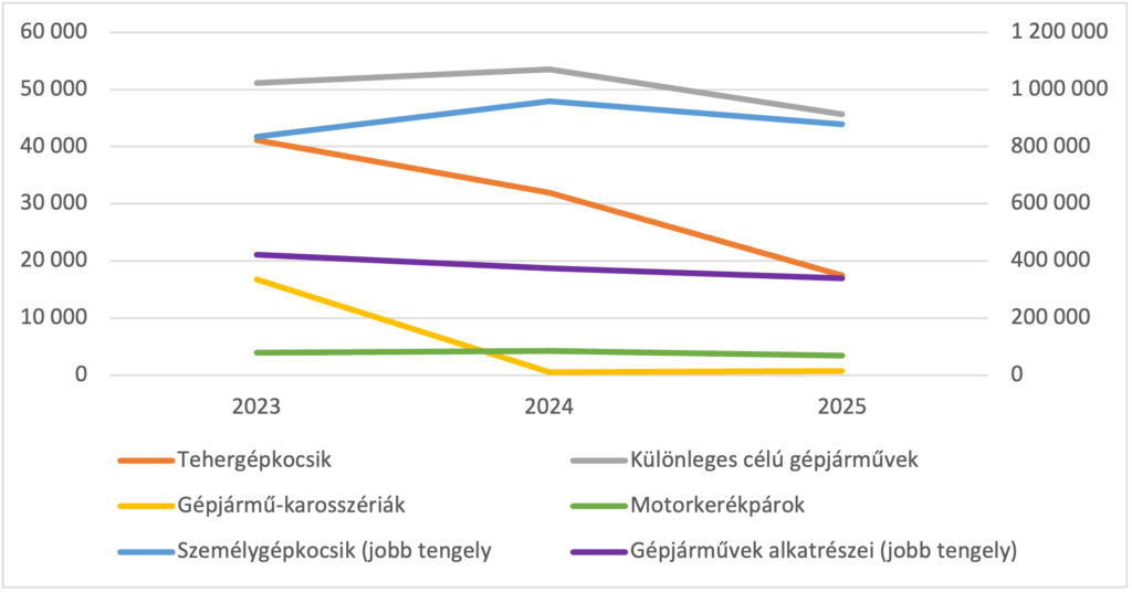 A termékcsoportok százalékos változását tekintve a személygépkocsik esetében 2024-ben még növekedés volt tapasztalható: a kivitel mennyisége +14,8%, értéke pedig +7,7%-kal nőtt. Ez azonban 2025-re megfordult: a volumen –8,5%, míg az exportérték már –17,0%-kal csökkent. Ez arra utal, hogy nemcsak kevesebb autót exportáltak, hanem az átlagár vagy a termékszerkezet is romlott.